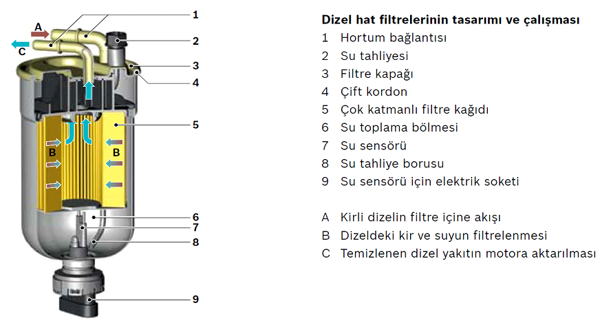 Dizel filtreleri, yabancı maddeleri ortadan kaldırmak ve dizel yakıtta bulunan suyu ayırmak üzere kullanılır. Bosch filtreleri bu iki işlevi ideal bir şekilde yapar.
