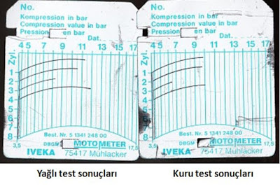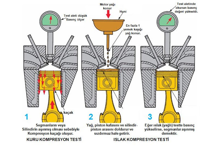 Motor kompresyon testi sırasıyla önce kuru kompresyon testi, daha sonra ıslak (yağ ile yapılan) kompresyon testi şeklinde yapılır.